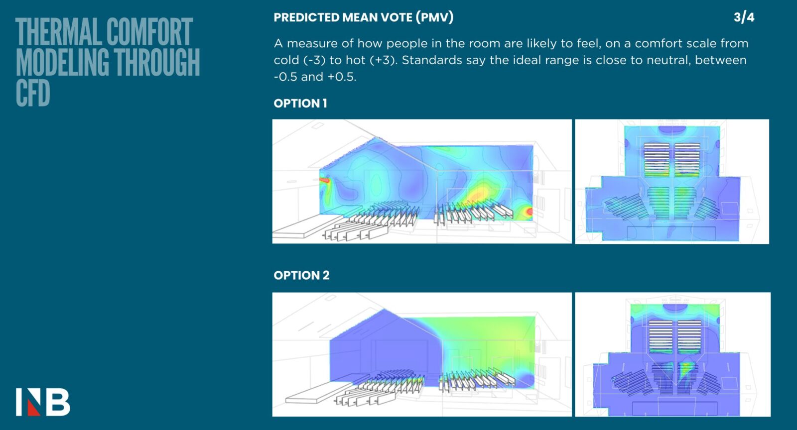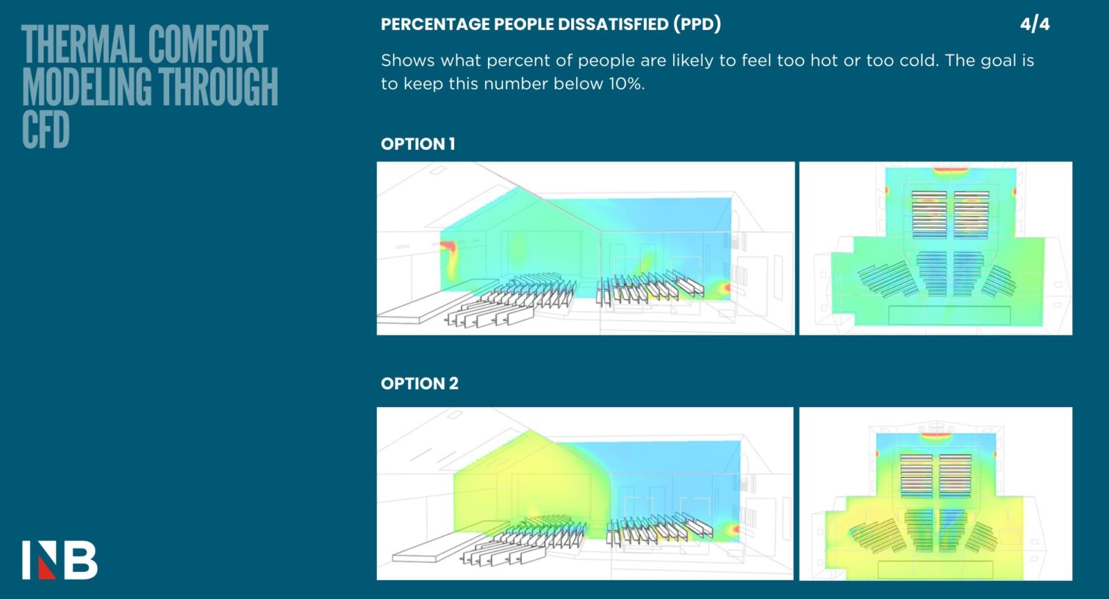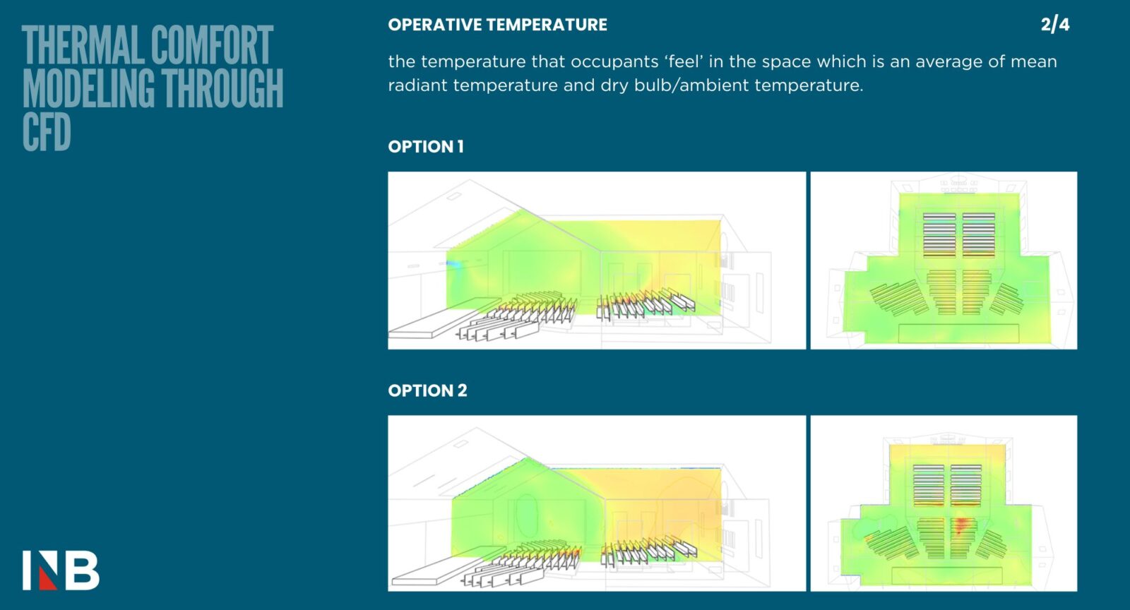 By simulating real-world conditions, CFD helped us measure thermal comfort using industry standards such as Operative Temperature, Predicted Mean Vote (PMV) and Percentage People Dissatisfied (PPD). The results guided design refinements that improved airflow, balanced temperatures, and maximized occupant comfort before construction began.